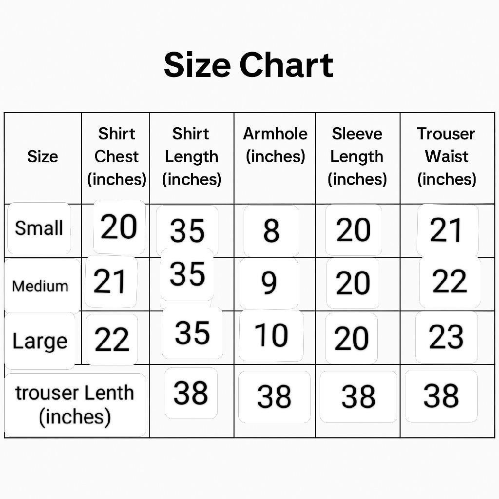 • Shirt Fabric: Cotton • Pattern: Embroidered • Neck Type: Round Neck • Shirt Pattern: Embroidered • Trouser Fabric: Cotton • Trouser Pattern: Plain • Product Feature: Size Chart Attached • Available Sizes: Small, Medium, Large • Number Of Pieces: 2 Pcs • Color: Black • Package Includes: 1 x Shirt, 1 x Trouser • Note: There might be an error of 1-3 cm due to manual measurement, and slight color differences may occur as a result of varying lighting and monitor effects.