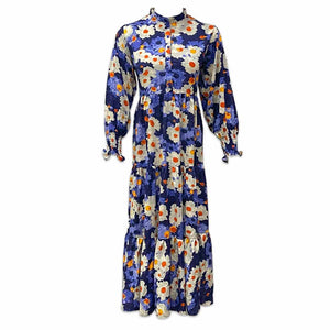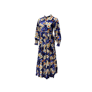 The vibrant orange floral pattern on a deep blue base adds a charming and feminine touch, making this dress a standout piece in any wardrobe. The long and elegant silhouette provides a flattering fit, while the relaxed design allows for easy movement and comfort. Its versatile appeal makes it suitable for both daytime and evening events, ensuring you always look effortlessly chic.