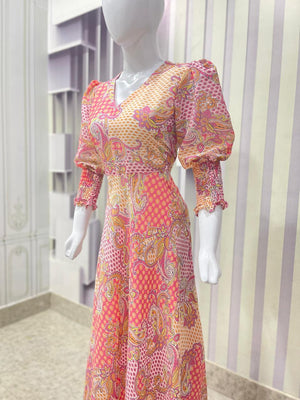 Step into elegance with the Cherrywears Women’s Pink Maxi Dress, a perfect blend of style, comfort, and sophistication. Designed with a flattering V-neckline, delicate floral print, and a flowing silhouette, this dress exudes effortless charm. The soft pink base enhances its feminine appeal, while the elastic waist and cuff details ensure a perfect fit that flatters all body types.