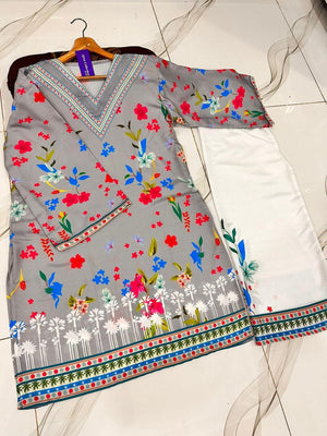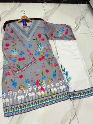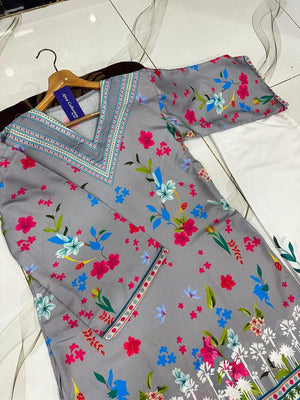 The set includes a round-neck printed shirt and a matching printed trouser, making it the perfect choice for casual wear, social gatherings, or everyday elegance. Crafted from premium Swiss Lawn, it offers breathability, comfort, and durability.