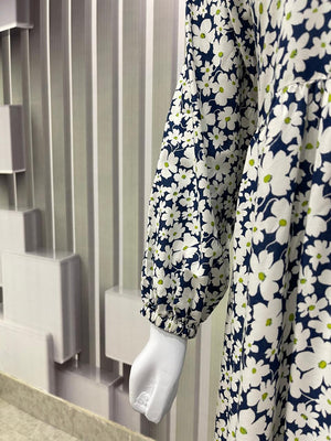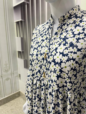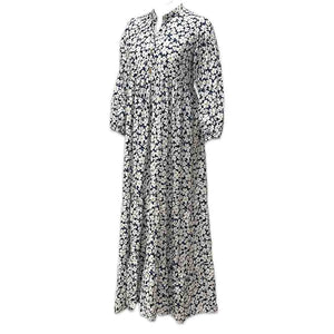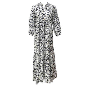 The delicate blue floral print on a pristine white base adds a touch of freshness and charm, making it ideal for weddings, garden parties, beach vacations, brunch dates, and casual outings. The graceful long silhouette provides a flattering and feminine look, while the loose-fit design allows for easy movement and a relaxed feel.